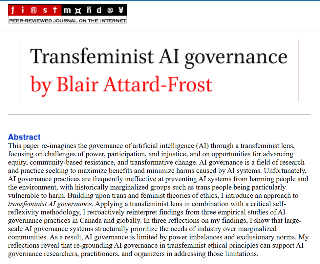 Transfeminist AI Governance – Research paper in April 2025 issue of First Monday. |