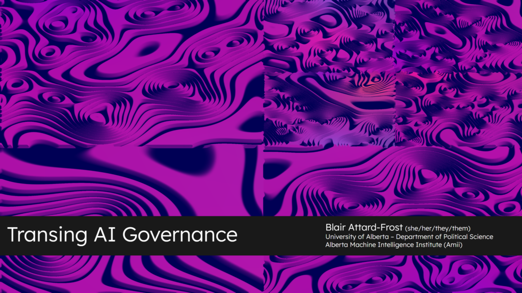 - Presentation slides: “AI governance in Canada: Power, participation, & limitations” (2025)